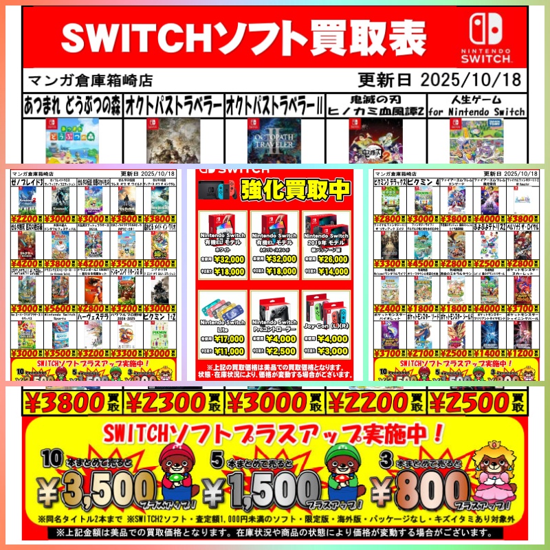 202510.19 ゲーム 高価買取の最適解!マンガ倉庫 箱崎店のNintendo Switch ソフト&本体買取情報!! アナタのゲームライフ、合理的に最適化しませんか? ただいまマンガ倉庫箱崎店では、遊び尽くした Nintendo Switch本体&ソフトの高価買取情報を随時更新しています!現在、SWITCHソフトプラスアップも実施中!あなたの資産を次の楽しみに変える絶好の機会です!賢く遊んで賢くお得に売っちゃおう! 箱崎店-ゲーム部門-ニンテンドースイッチ買取-2025-10-19 ※掲載中の買取価格は2025/10/19(日)現在のものとなります。当店在庫・市場相場等の理由により、予告なく価格を変更する場合があります。予めご了承下さい。 LINE公式アカウントをフォロー LINE公式アカウントを友だち登録して最新情報をチェックしよう!