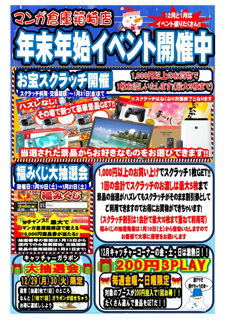 2025年12月20日よりスタート!マンガ倉庫箱崎店で1000円以上お買い上げいただくと「お宝スクラッチ」をプレゼント!その場でコスって豪華景品ゲットのチャンス!人気ゲーム機、生活家電、グルメギフト、年越しそば&年明けうどん…貰ってウレシイお宝揃い!買って!買って!!買って!!! でっかくチャンス拡大だ!