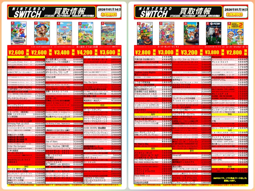 202601.17 ゲーム お宝買取団東広島店Switchソフト高価買取情報!遊びつくしたゲームは高く売って完全攻略だ! お宝買取団東広島店ゲームコーナーからニンテンドースイッチソフト最新買取チラシが登場!定番の人気タイトルから最新作まで幅広く強化買取を行っています!遊び尽くしたゲームは高く売って完全攻略しちゃおう! 東広島店-ゲーム部門-ニンテンドースイッチ買取-2026-01-17 ※掲載中の買取価格は2026/01/17(土)現在のものとなります。当店在庫・市場相場等の理由により、予告なく価格を変更する場合があります。予めご了承下さい。 LINE公式アカウントをフォロー LINE公式アカウントを友だち登録して最新情報をチェックしよう!
