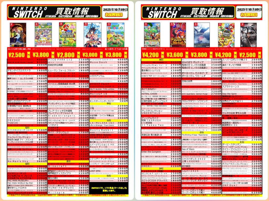 202510.10 ゲーム 遊び終わったゲームを高く売るビッグチャンス!東広島店ゲームコーナー、ただいまニンテンドースイッチソフト激アツ買取強化中!! 東広島店スタッフです!遊び尽くしたニンテンドースイッチソフト、棚や引き出しで眠っていませんか? 今こそ高く売れちゃう激アツチャンスです!お宝買取団東広島店の高価買取でお小遣いをガッポリ稼ごう!新作もロングヒット作品も大歓迎!あなたのお持ち込み、お待ちしております! 東広島店-ゲーム部門-ニンテンドースイッチ買取-2025-10-10 ※掲載中の買取価格は2025/10/10(金)現在のものとなります。当店在庫・市場相場等の理由により、予告なく価格を変更する場合があります。予めご了承下さい。 LINE公式アカウントをフォロー LINE公式アカウントを友だち登録して最新情報をチェックしよう!