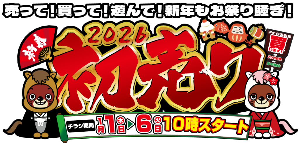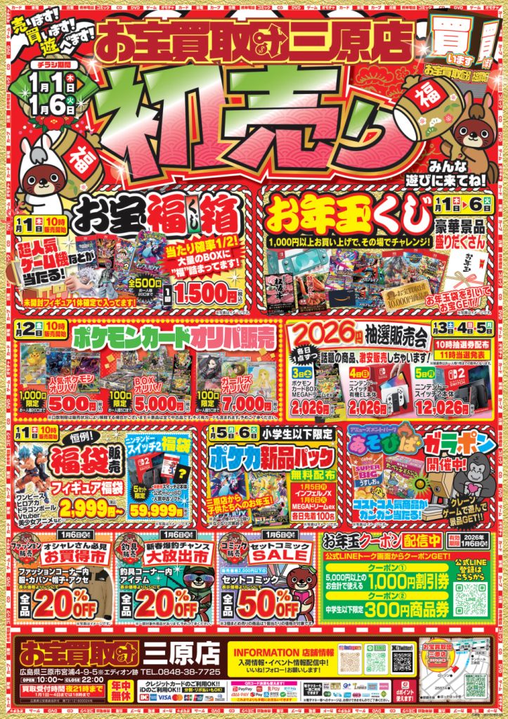 あけましておめでとうございます!お宝買取団三原店は新年も売って!買って!遊んでお得なイベント満載!ざっくざくのお宝と一緒に2026年の到来をお祝いしちゃいましょう!盛りだくさんのセールをチラシでチェック!
