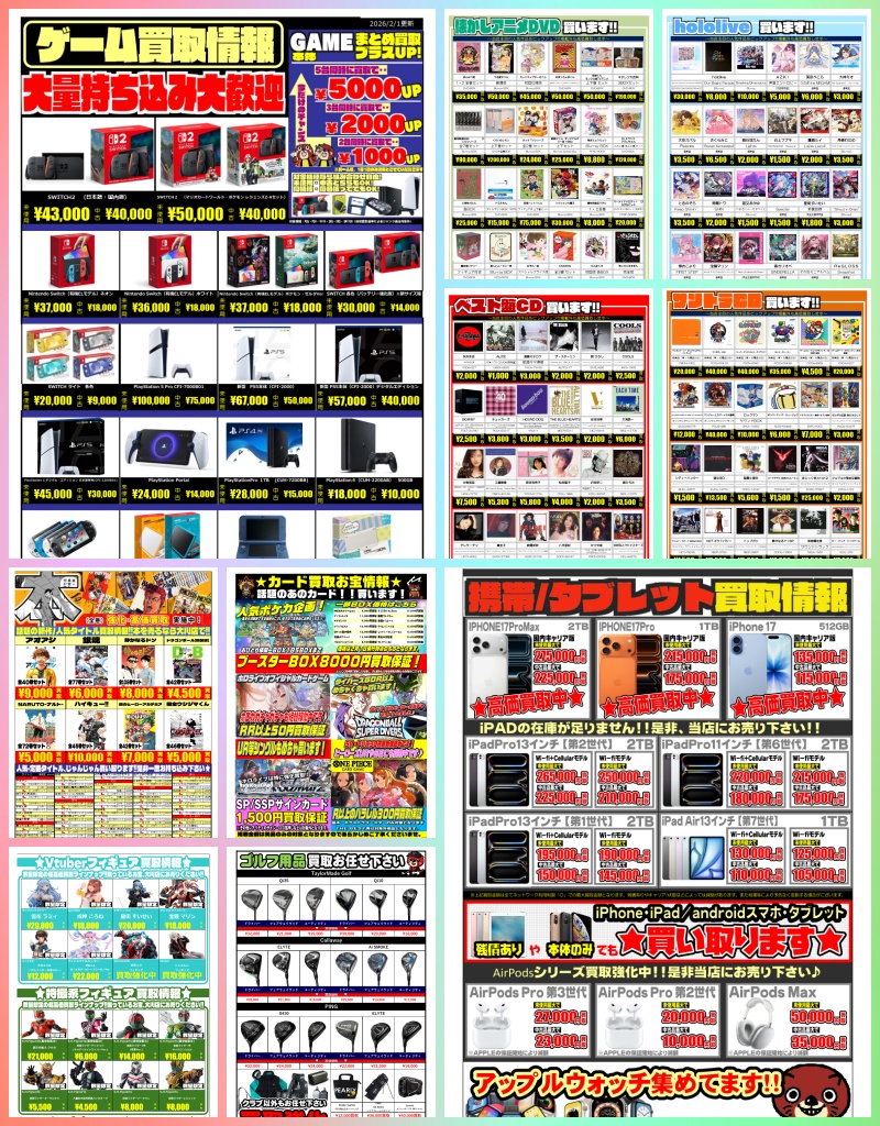 202602.01 お知らせ あまーい買取たっぷり!お宝Times2月号Web版配信開始! 2月といえばバレンタイン!あまあまのチョコレートを期待してるキミにマンガ倉庫大川店はあまーいお宝買取をたっぷりご用意致しました!チョコもいいけど高価買取も大歓迎!是非ともお売りください! お宝Times大川版 高価買取情報 ※掲載中の買取価格は2026/02/01(日)現在のものとなります。当店在庫・市場相場等の理由により、予告なく価格を変更する場合があります。予めご了承下さい。 LINE公式アカウントをフォロー LINE公式アカウントを友だち登録して最新情報をチェックしよう!