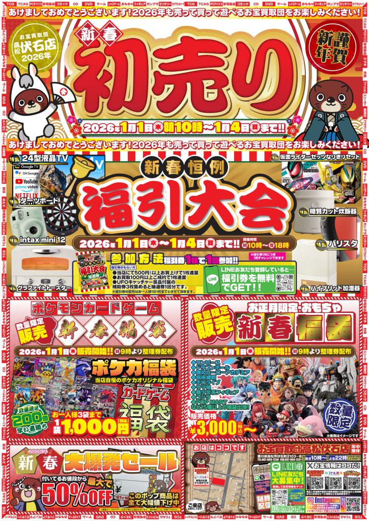 あけましておめでとうございます!お宝買取団高松伏石店は元旦からフルスロットル! 「売って・買って・遊べる」お宝の祭典がいよいよ始まります。 皆様の期待を上回る超豪華なイベントとお得なセールが目白押し!新しい年の幕開けは、ぜひ伏石店でお楽しみください!