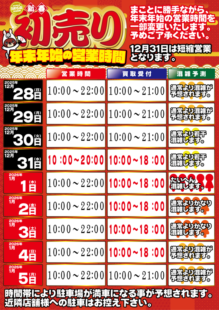 年末年始の混雑予測案内です。混雑予想日は【1/1】【1/2】【1/3】となります。 年末年始のシーズンは多数のお客様にご来店頂けますので、買取査定や売場応対などの業務については、通常より大幅にお時間を頂く場合があります。予めご了承ください。