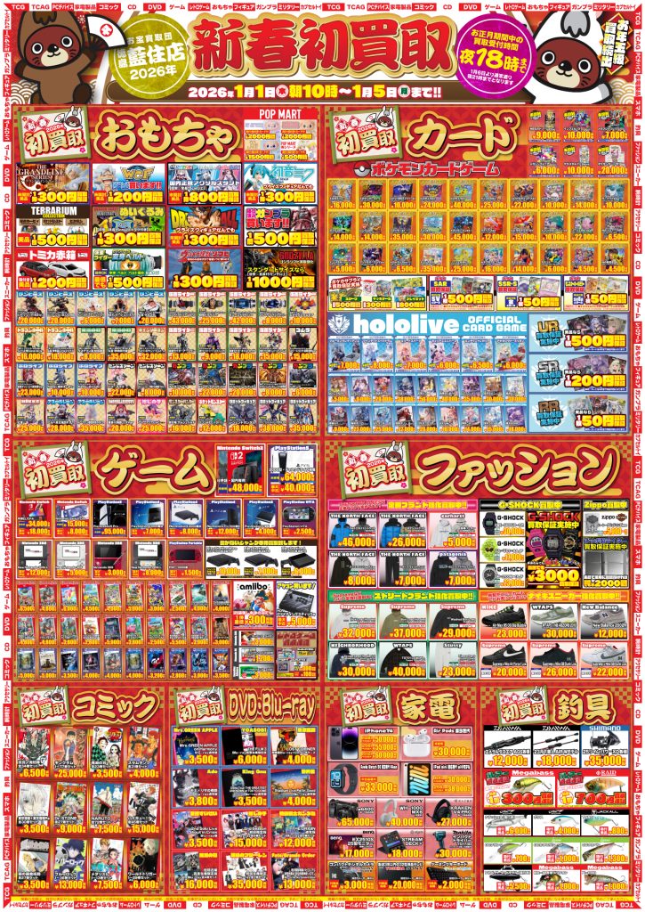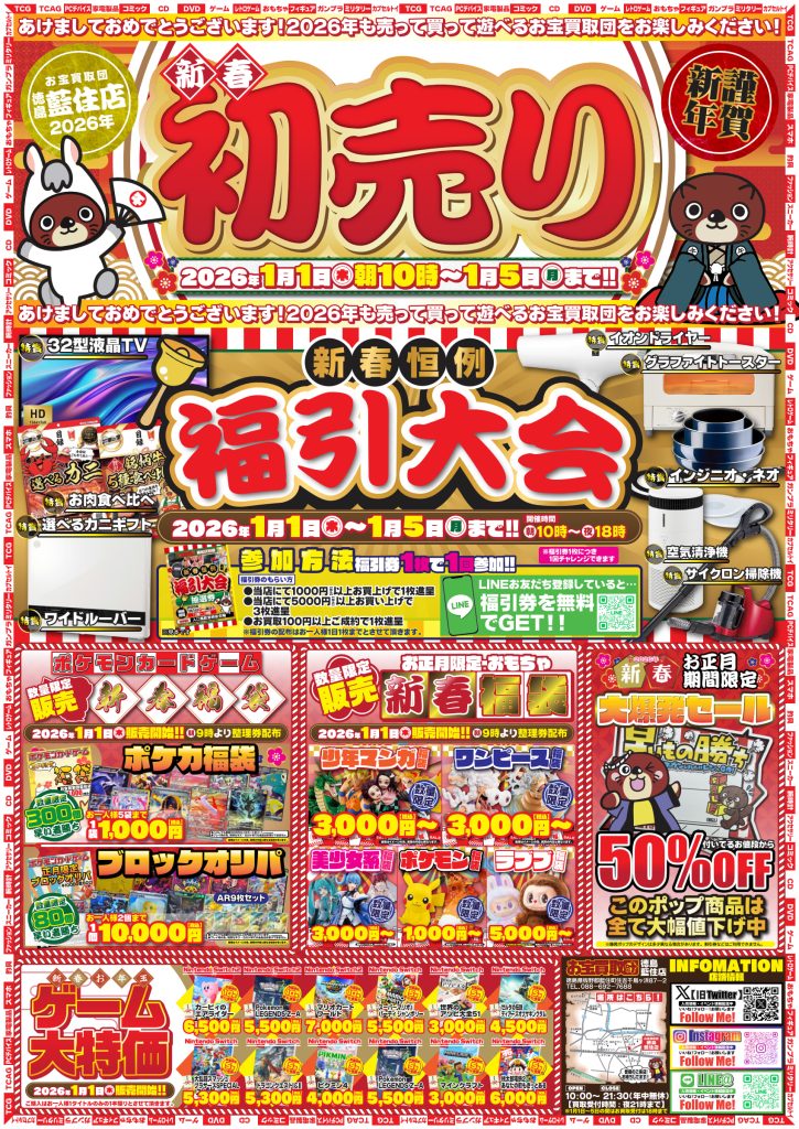 あけましておめでとうございます!2026年、お宝買取団藍住店は新年早々エンジン全開!「売って・買って・遊べる」お宝の祭典がいよいよ開幕です! ざっくざくのお宝と一緒に、新しい年の幕開けを最高にお得に祝いましょう!盛りだくさんのイベントを今すぐチェック!