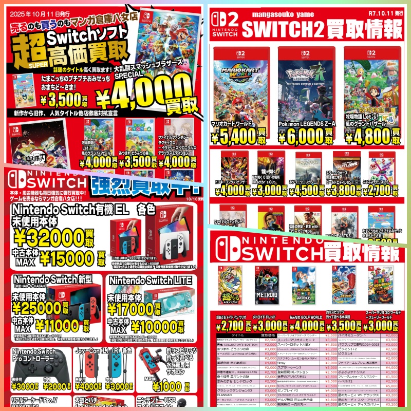 202510.10 ゲーム ワクワク&高価買取が止まらない!ニンテンドーSwitch&Switch2、地域イチバン目指して買いまくります!! 全世界震撼の神ハード・ニンテンドースイッチ2の話題で持ちきりの今こそチャンス!遊び尽くしたニンテンドースイッチ本体&ソフト、そしてSwitch2ソフト買取大・大・大歓迎です!アナタのお宝をオイシく売って、次なるワクワクの資金をたっぷりゲットしてください! アナタの買取、お待ちしております! 八女店-ゲーム部門-ニンテンドースイッチ買取情報 ※掲載中の買取価格は2025/10/10(金)現在のものとなります。当店在庫・市場相場等の理由により、予告なく価格を変更する場合があります。予めご了承下さい。 LINE公式アカウントをフォロー LINE公式アカウントを友だち登録して最新情報をチェックしよう!