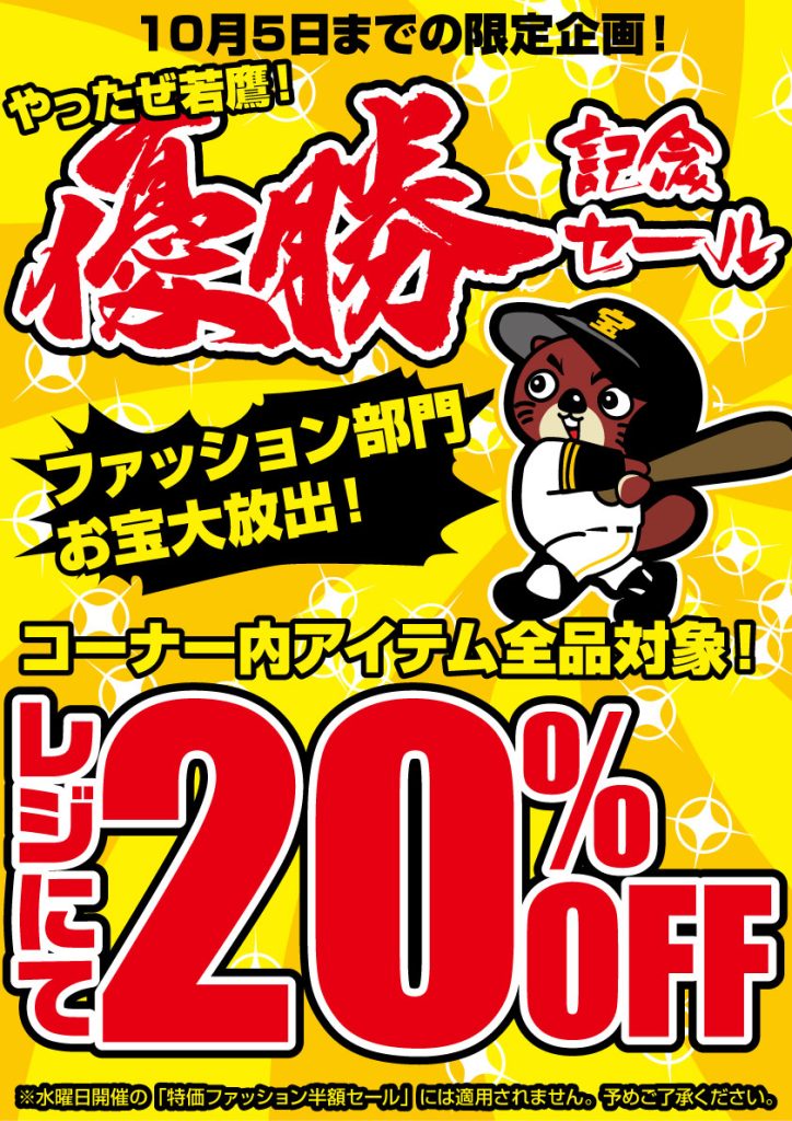 ファッションコーナー全ジャンル対象!表示価格よりレジにて更に20%OFF!!